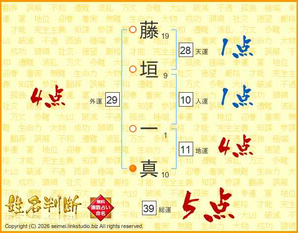 藤垣一真さんの総運は39画の5点!