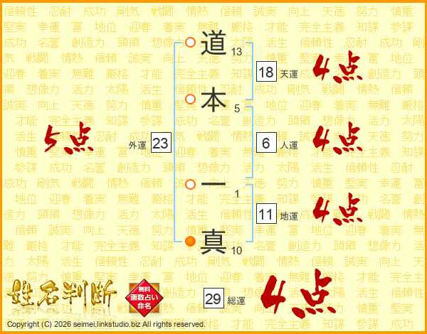 あなたの人生を表す1番重要な運勢です。生涯を通じて影響する総合運となり、主に50歳以降の晩年期に影響を及ぼします。苗字と名前の合計画数。