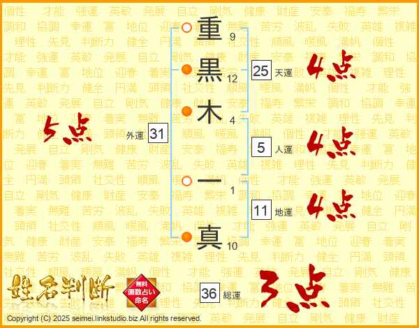 重(9画)黒(12画)木(4画) 一(1画)真(10画)