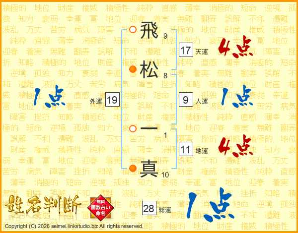 生活面を象徴する運勢です。外部から受ける影響力を表し、結婚運、家庭運や職場、環境への順応性を表します。総運から人運を引いた画数。姓や名が1文字の場合を除く。