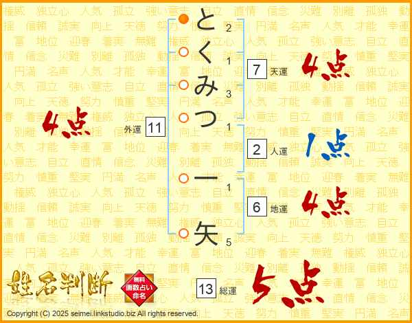 生活面を象徴する運勢です。外部から受ける影響力を表し、結婚運、家庭運や職場、環境への順応性を表します。総運から人運を引いた画数。姓や名が1文字の場合を除く。