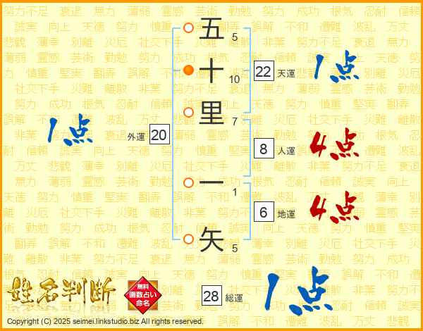 生活面を象徴する運勢です。外部から受ける影響力を表し、結婚運、家庭運や職場、環境への順応性を表します。総運から人運を引いた画数。姓や名が1文字の場合を除く。