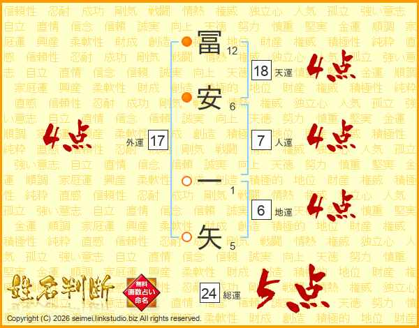 生活面を象徴する運勢です。外部から受ける影響力を表し、結婚運、家庭運や職場、環境への順応性を表します。総運から人運を引いた画数。姓や名が1文字の場合を除く。