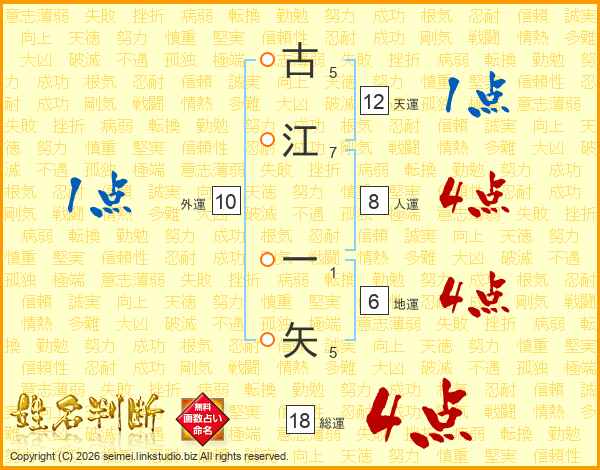 画数の奇数(○陽)と偶数(●陰)の配列で吉凶を占います。どちらかにかたよる名前は大凶名で避ける必要があります。画数の奇数偶数。