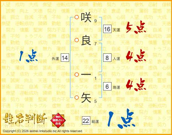生活面を象徴する運勢です。外部から受ける影響力を表し、結婚運、家庭運や職場、環境への順応性を表します。総運から人運を引いた画数。姓や名が1文字の場合を除く。