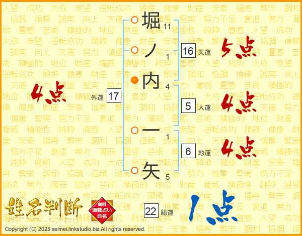 堀(11画)ノ(1画)内(4画) 一(1画)矢(5画)
