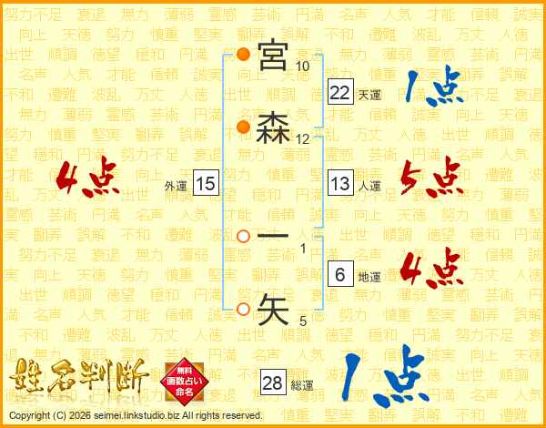生活面を象徴する運勢です。外部から受ける影響力を表し、結婚運、家庭運や職場、環境への順応性を表します。総運から人運を引いた画数。姓や名が1文字の場合を除く。