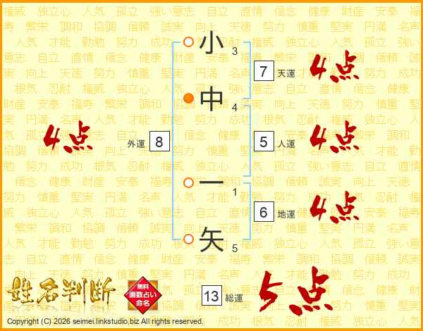 生活面を象徴する運勢です。外部から受ける影響力を表し、結婚運、家庭運や職場、環境への順応性を表します。総運から人運を引いた画数。姓や名が1文字の場合を除く。