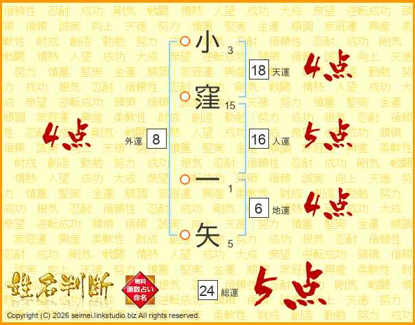 生活面を象徴する運勢です。外部から受ける影響力を表し、結婚運、家庭運や職場、環境への順応性を表します。総運から人運を引いた画数。姓や名が1文字の場合を除く。