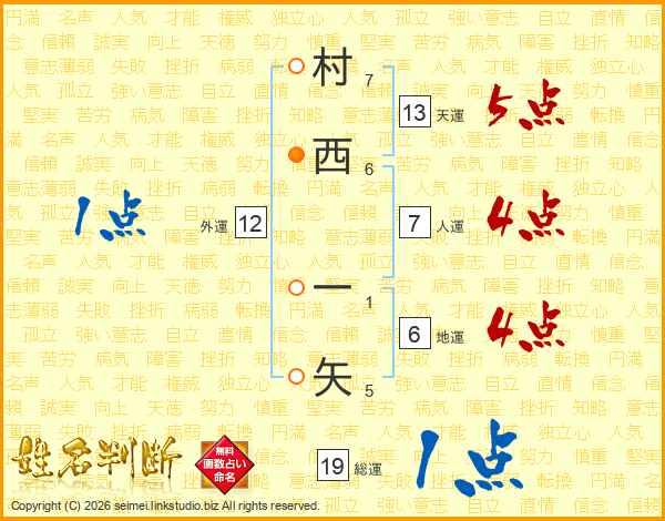 生活面を象徴する運勢です。外部から受ける影響力を表し、結婚運、家庭運や職場、環境への順応性を表します。総運から人運を引いた画数。姓や名が1文字の場合を除く。