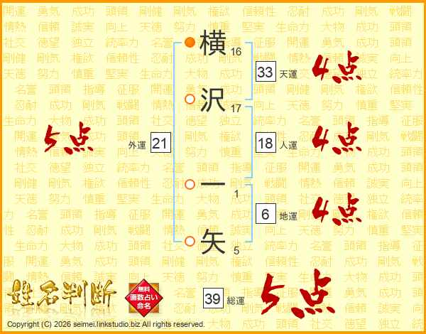 横沢一矢さんの総運は39画の5点!