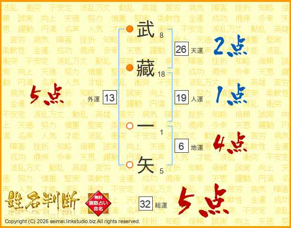 武藏一矢さんの総運は32画の5点!