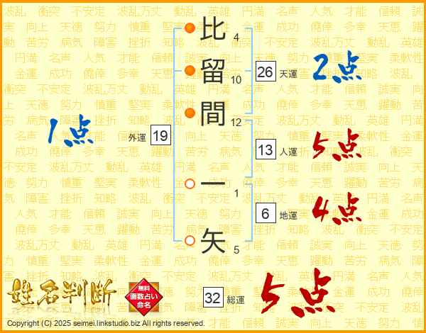 比留間一矢さんの総運は32画の5点!