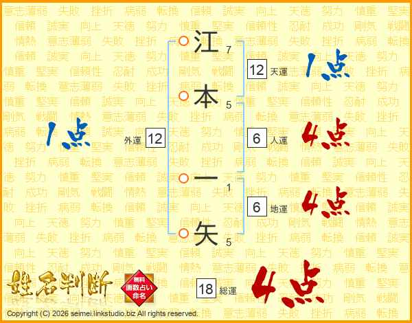 生活面を象徴する運勢です。外部から受ける影響力を表し、結婚運、家庭運や職場、環境への順応性を表します。総運から人運を引いた画数。姓や名が1文字の場合を除く。