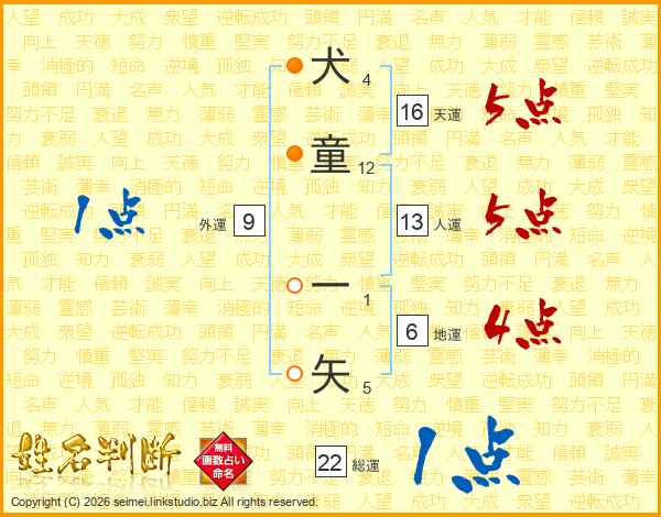 あなたの人生を表す1番重要な運勢です。生涯を通じて影響する総合運となり、主に50歳以降の晩年期に影響を及ぼします。苗字と名前の合計画数。