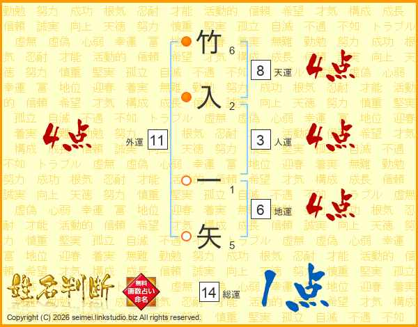 生活面を象徴する運勢です。外部から受ける影響力を表し、結婚運、家庭運や職場、環境への順応性を表します。総運から人運を引いた画数。姓や名が1文字の場合を除く。