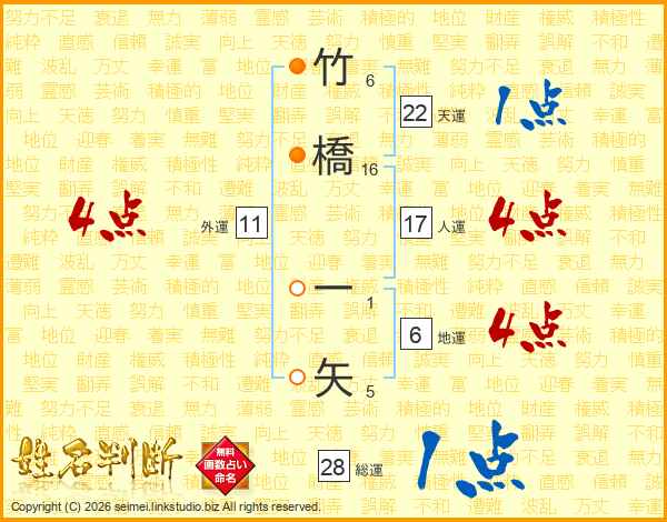 竹(6画)橋(16画) 一(1画)矢(5画)