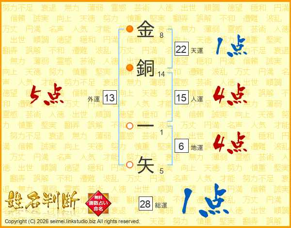 生活面を象徴する運勢です。外部から受ける影響力を表し、結婚運、家庭運や職場、環境への順応性を表します。総運から人運を引いた画数。姓や名が1文字の場合を除く。