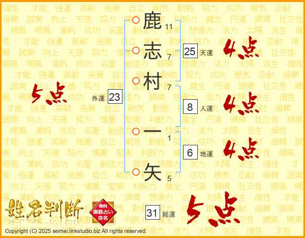 鹿(11画)志(7画)村(7画) 一(1画)矢(5画)