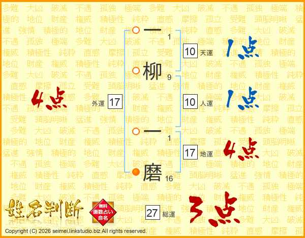 一柳一磨さんの総運は27画の3点!