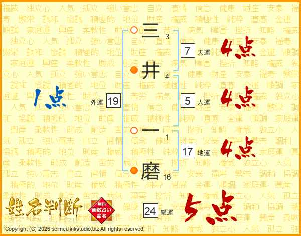 生活面を象徴する運勢です。外部から受ける影響力を表し、結婚運、家庭運や職場、環境への順応性を表します。総運から人運を引いた画数。姓や名が1文字の場合を除く。
