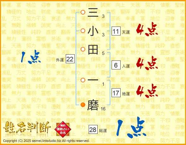 生活面を象徴する運勢です。外部から受ける影響力を表し、結婚運、家庭運や職場、環境への順応性を表します。総運から人運を引いた画数。姓や名が1文字の場合を除く。