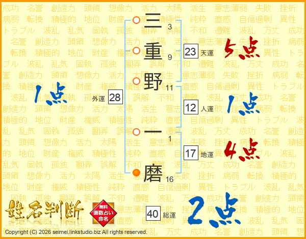 生活面を象徴する運勢です。外部から受ける影響力を表し、結婚運、家庭運や職場、環境への順応性を表します。総運から人運を引いた画数。姓や名が1文字の場合を除く。