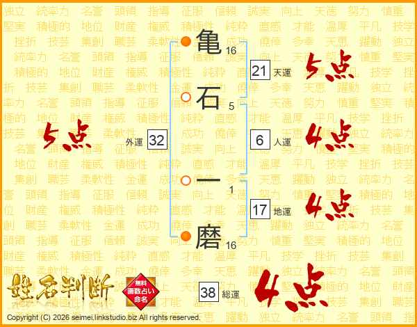 亀(16画)石(5画) 一(1画)磨(16画)