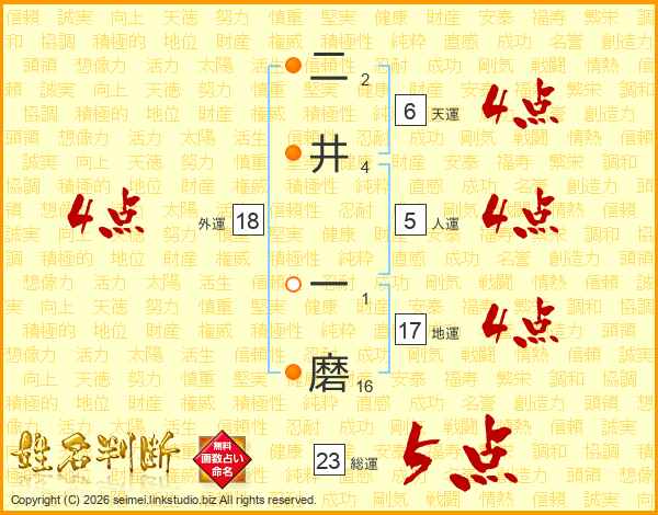 生活面を象徴する運勢です。外部から受ける影響力を表し、結婚運、家庭運や職場、環境への順応性を表します。総運から人運を引いた画数。姓や名が1文字の場合を除く。