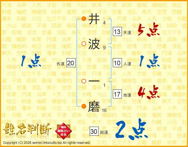 生活面を象徴する運勢です。外部から受ける影響力を表し、結婚運、家庭運や職場、環境への順応性を表します。総運から人運を引いた画数。姓や名が1文字の場合を除く。