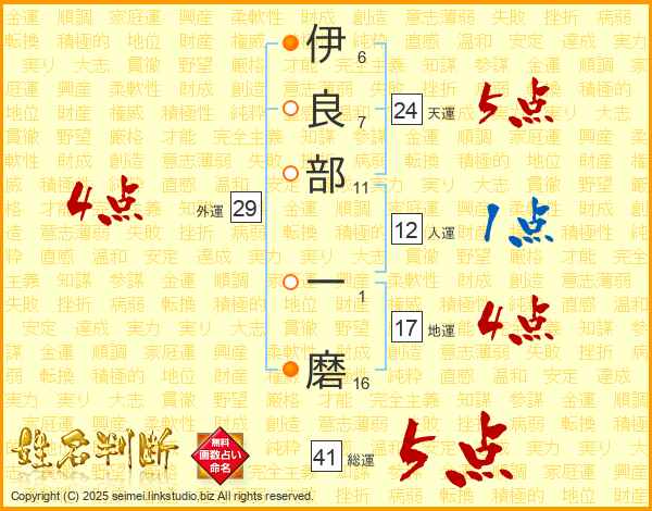 伊(6画)良(7画)部(11画) 一(1画)磨(16画)