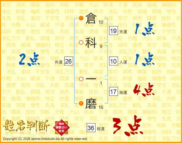 生活面を象徴する運勢です。外部から受ける影響力を表し、結婚運、家庭運や職場、環境への順応性を表します。総運から人運を引いた画数。姓や名が1文字の場合を除く。