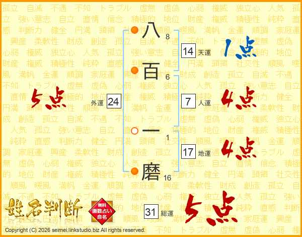 八百一磨さんの総運は31画の5点!