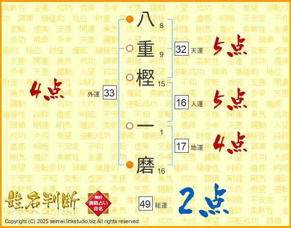 八(8画)重(9画)樫(15画) 一(1画)磨(16画)