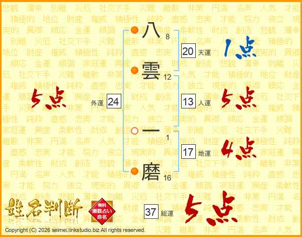 八雲一磨さんの総運は37画の5点!