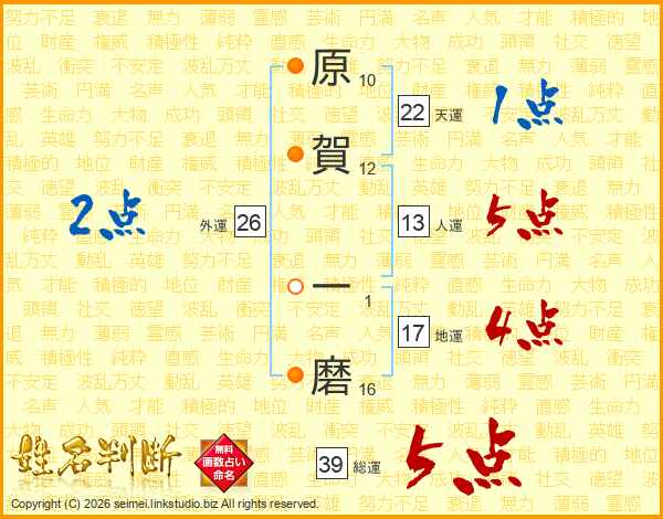 原賀一磨さんの総運は39画の5点!