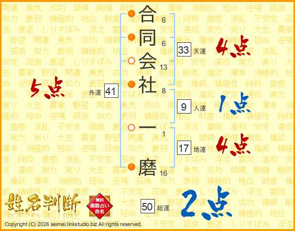 生活面を象徴する運勢です。外部から受ける影響力を表し、結婚運、家庭運や職場、環境への順応性を表します。総運から人運を引いた画数。姓や名が1文字の場合を除く。