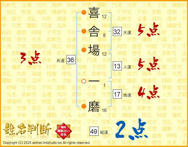 喜(12画)舎(8画)場(12画) 一(1画)磨(16画)