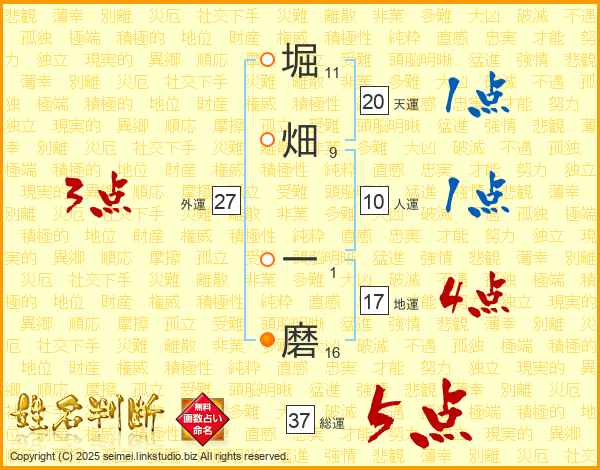 堀(11画)畑(9画) 一(1画)磨(16画)