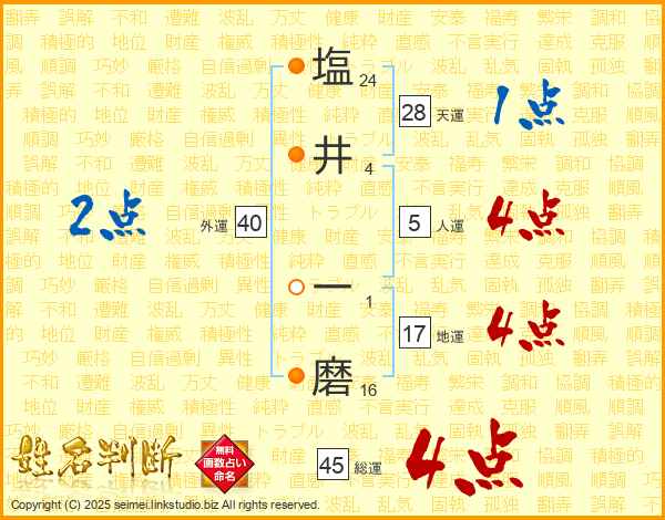 生活面を象徴する運勢です。外部から受ける影響力を表し、結婚運、家庭運や職場、環境への順応性を表します。総運から人運を引いた画数。姓や名が1文字の場合を除く。
