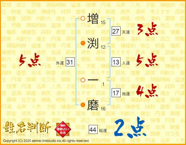 生活面を象徴する運勢です。外部から受ける影響力を表し、結婚運、家庭運や職場、環境への順応性を表します。総運から人運を引いた画数。姓や名が1文字の場合を除く。
