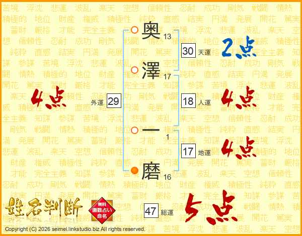 奥(13画)澤(17画) 一(1画)磨(16画)