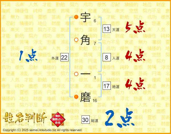 生活面を象徴する運勢です。外部から受ける影響力を表し、結婚運、家庭運や職場、環境への順応性を表します。総運から人運を引いた画数。姓や名が1文字の場合を除く。