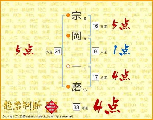 宗(8画)岡(8画) 一(1画)磨(16画)