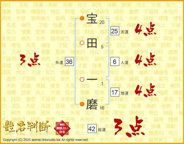 宝田一磨さんの天運は25画の4点!