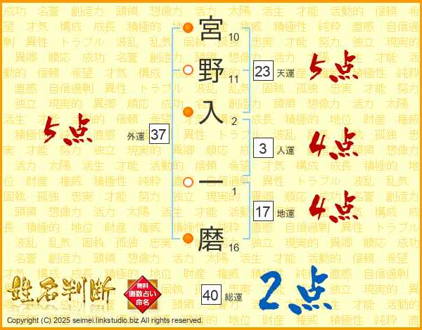 生活面を象徴する運勢です。外部から受ける影響力を表し、結婚運、家庭運や職場、環境への順応性を表します。総運から人運を引いた画数。姓や名が1文字の場合を除く。