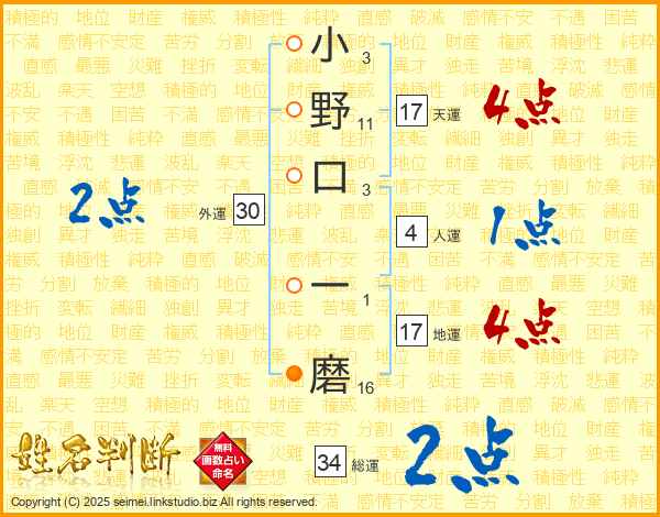 小(3画)野(11画)口(3画) 一(1画)磨(16画)