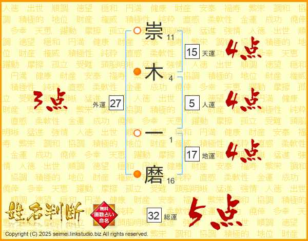 崇木一磨さんの総運は32画の5点!
