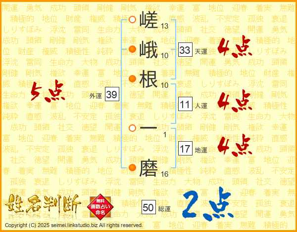 嵯(13画)峨(10画)根(10画) 一(1画)磨(16画)