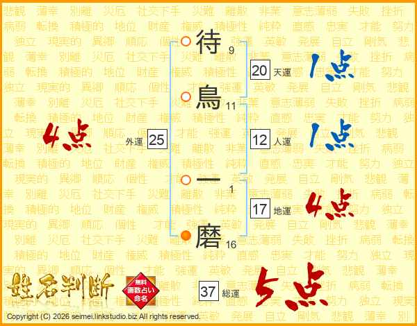 待(9画)鳥(11画) 一(1画)磨(16画)